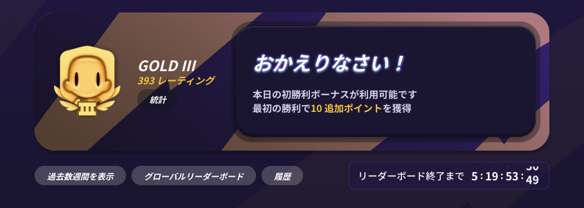 Duelというのは前回の記事でも書きましたが対戦モードのことですね。そのランクがGoldに到達しましたー